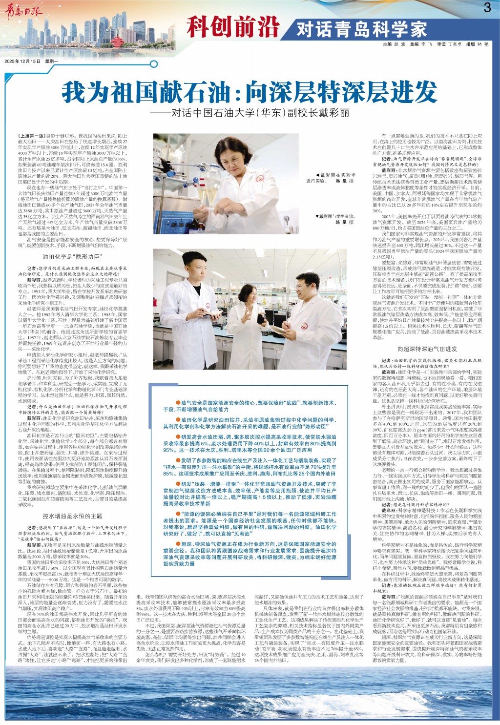 戴彩丽:“能源的饭碗必须端在自己手里”是对我们每一名能源领域科研工作者提出的要求。能源是一个国家经济社会发展的根基,任何时候都不能缺。对我来说,就是坚持真做科研,做有用的科研,做解决问题的科研。油田化学研究好了、做好了,就可以直接“见着油”。每次看到新技术应用,开采出更多石油,我都特别有自豪感和成就感,因为这是用实际行动为祖国献石油。
