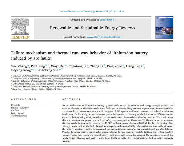 【本站讯】近日,机电工程学院安全工程博士研究生张越在电弧故障诱导锂离子电池失效研究方面取得重要进展,相关成果《故障电弧诱导锂离子电池失效机理及热失控行为》(Failure mechanism and thermal runaway behavior of lithium-ion battery induced by arc faults)发表在《Renewable and Sustainable Energy Reviews》。《Renewable and Sustainable Energy Reviews》是能源与化学领域的国际顶级期刊,目前影响因子为16.3(SCI一区Top)。论文第一作者为博士研究生张越,通讯作者为孔得朋教授和殷晓康教授,开云电竞投注(华东)为第一署名单位和唯一通讯单位,该研究得到了国家自然科学基金和国家重点研发计划的资助支持。