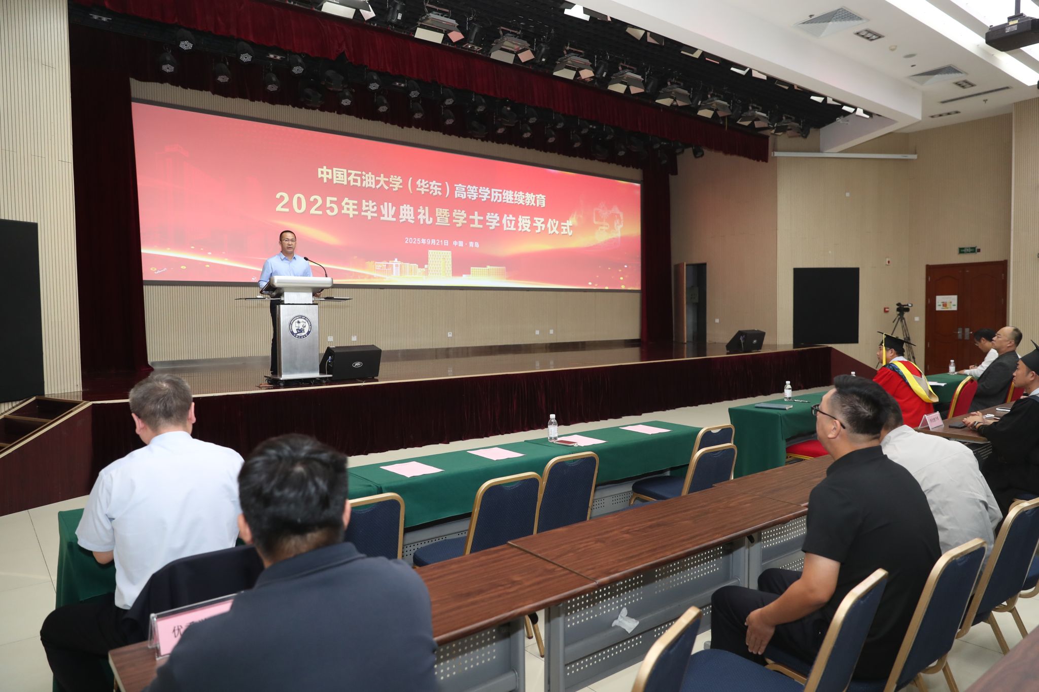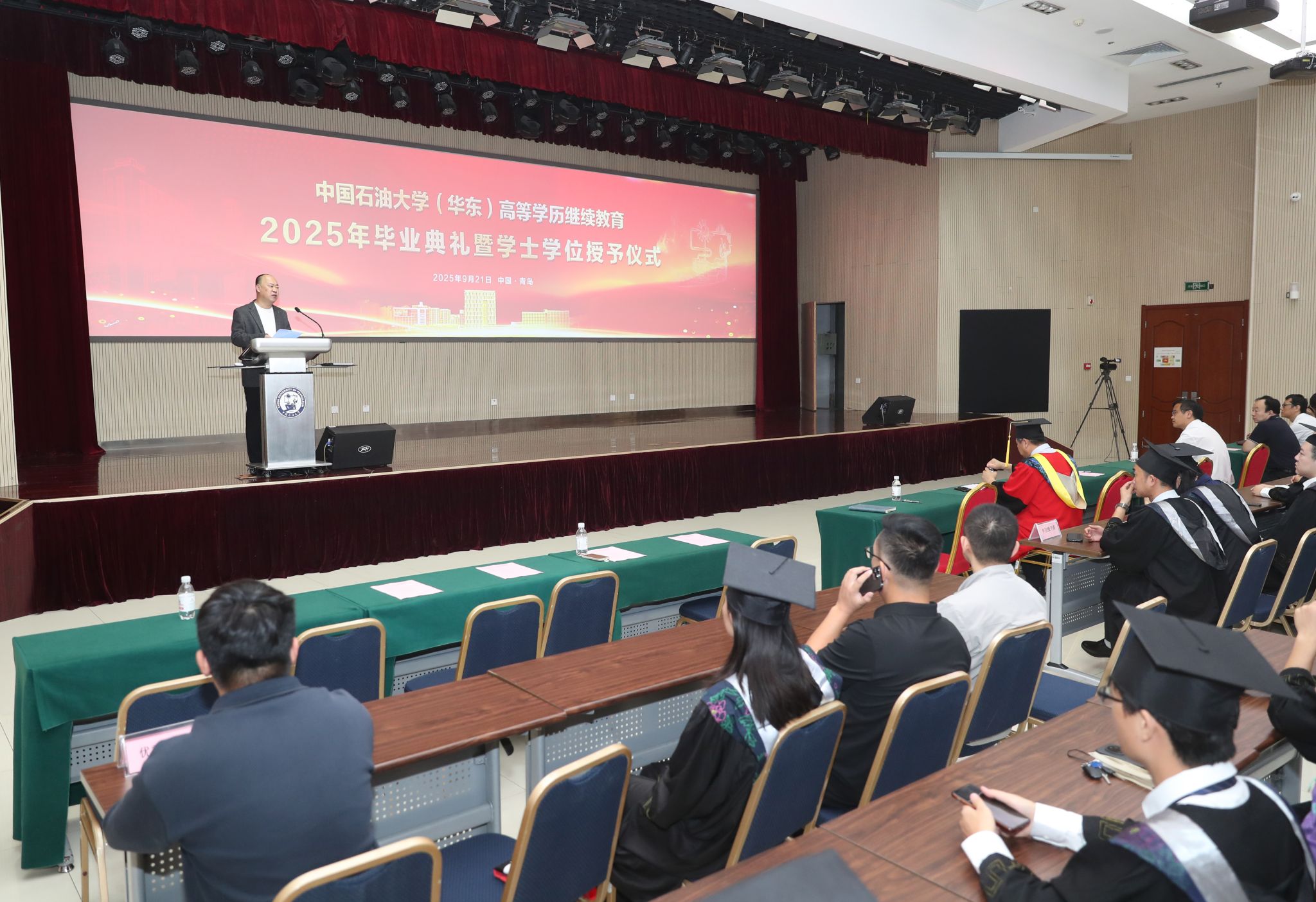 【本站讯】9月21日上午,我校学历继续教育2025年毕业典礼暨学位授予仪式在唐岛湾校区培训楼多功能厅举行。来自青岛、济南、烟台等地的120余位毕业生代表携家人在现场,与全国通过直播观礼的近千名师生一道,共同见证毕业的这一荣耀时刻。