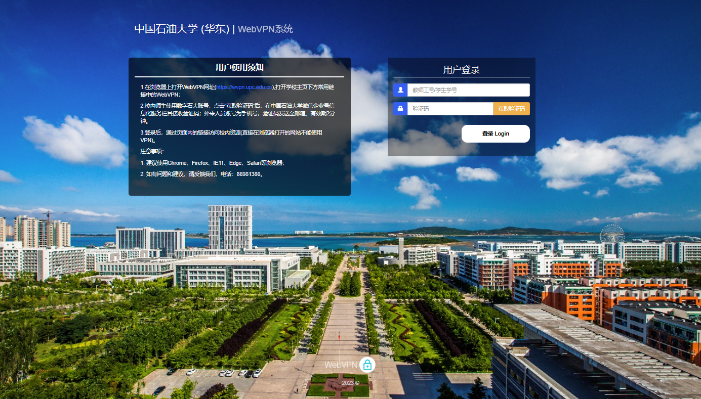 1.访问地址:在浏览器中输入WebVPN网址https://webvpn.upc.edu.cn,或打开学校主页下方常用链接中的WebVPN,如下图所示: