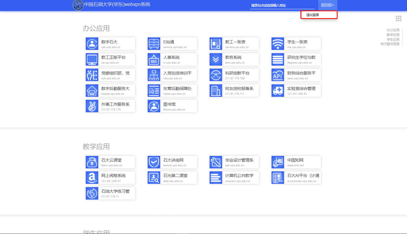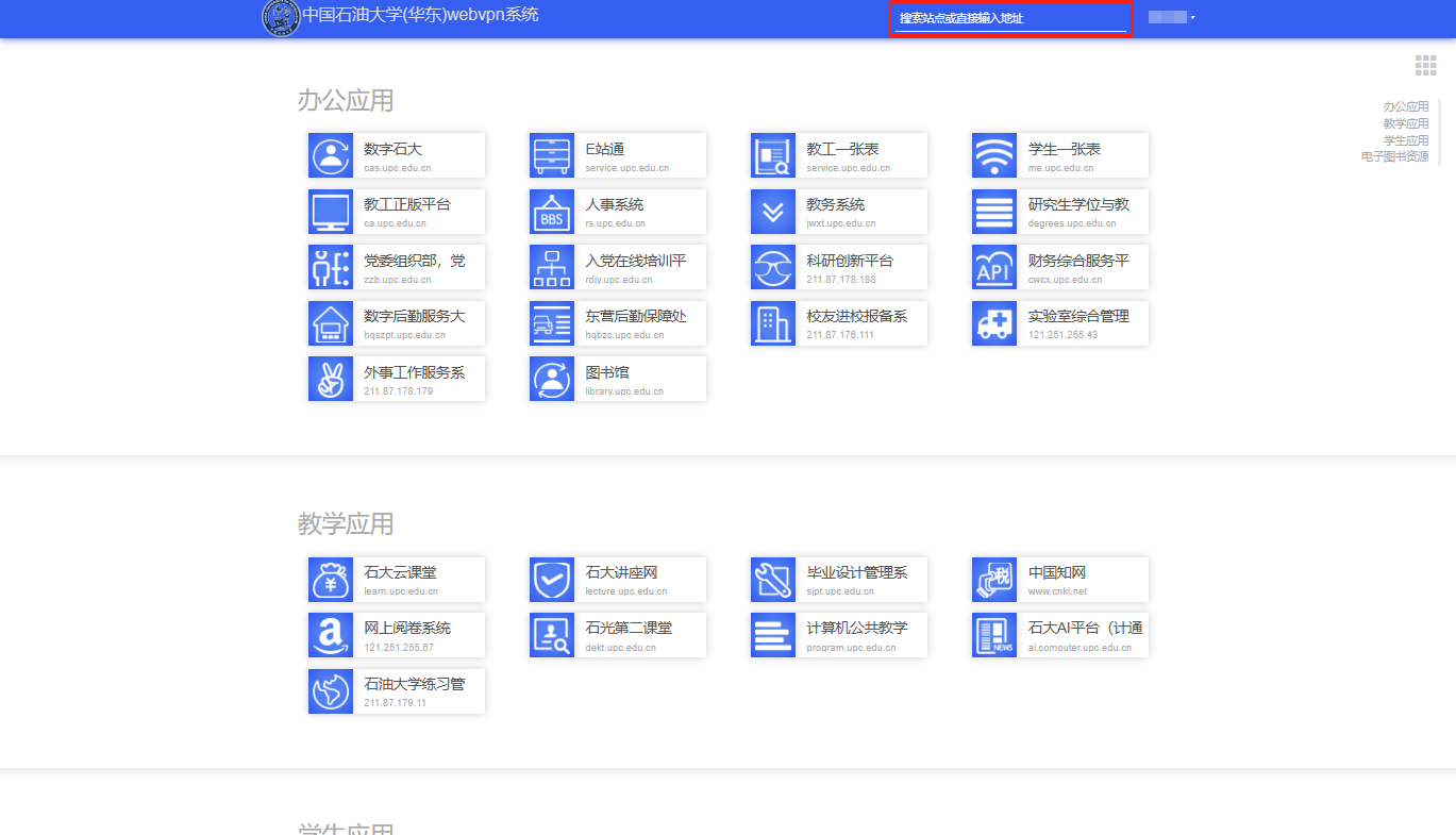 3.资源访问:登录成功后,通过VPN页面内的链接或手工输入以upc.edu.cn结尾的域名进行访问,如下图: