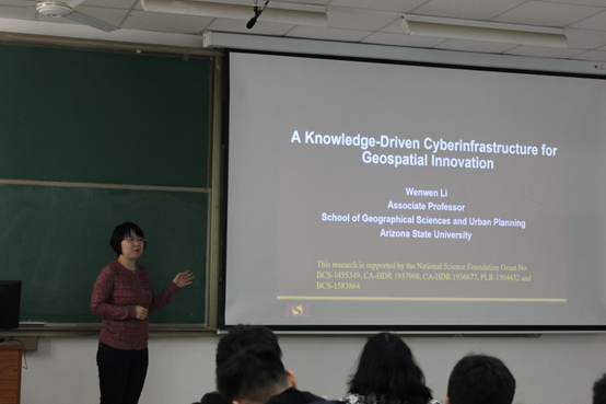 11月29日上午,依托科技部2019年度高端外国专家引进计划“海洋综合导航定位理论与方法国际合作研究”项目的支持,亚利桑那州立大学(Arizona State University)李文雯副教授应邀来校进行学术交流,为我院师生做了题为“A Knowledge Driven Cyberinfrastructure for Geospatial Innovation”的学术报告,并与师生进行了讨论和交流。