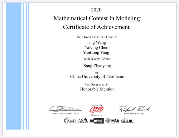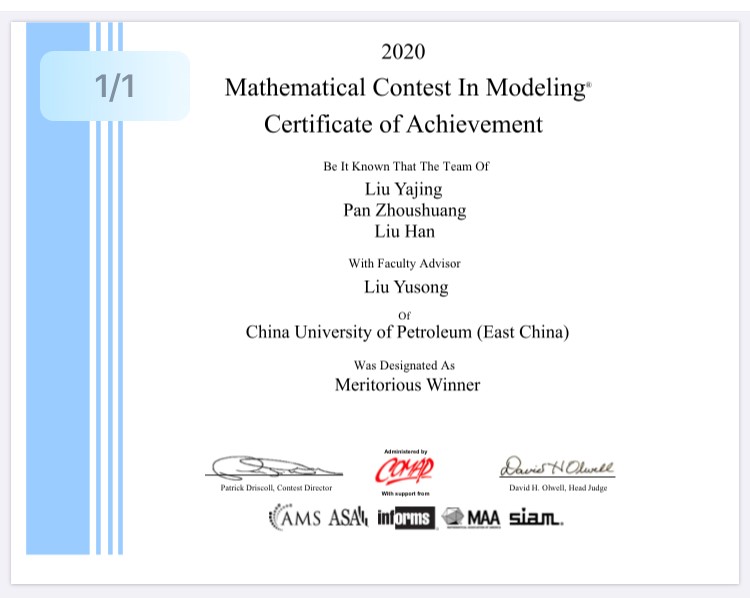 日前,2020年美国大学生数学建模竞赛成绩揭晓,我院本科生在比赛中表现优异取得佳绩。其中,我院地理信息科学1701班的肖紫寒同学与同组队友获得Finalist Winner(简称F奖),电子信息工程17级的刘雅静、潘周双、刘晗组和通信工程17级的吴颛宇、高翔、张天组获得Meritorious Winner(简称M奖),通信工程17级的陈亚宁同学与同组队友获得Honorable Mention(简称H奖),另外海空学院的聂子豪、李恺文、洪珊和潘兆杰等36位同学与队友获得Successful Participant(成功参赛)。