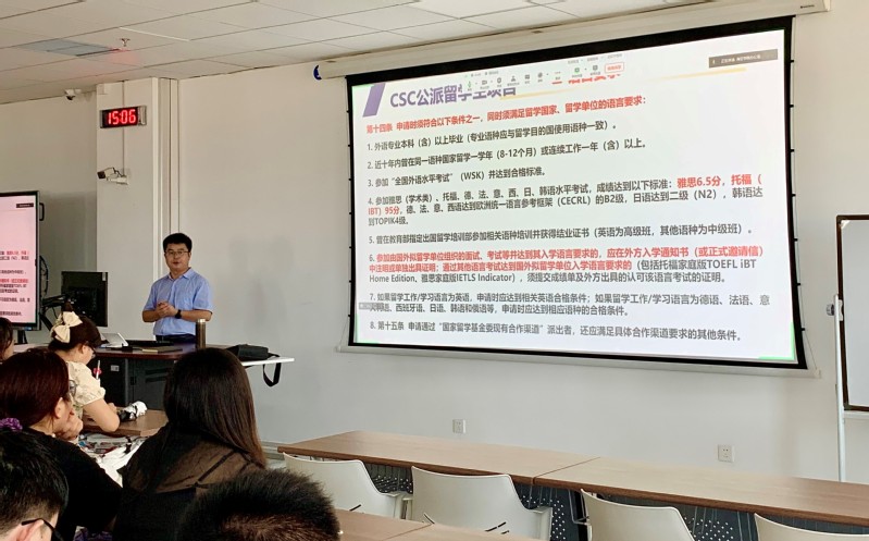 随后,贺院长分享了海空学院学生出国留学的情况和主要途径。其中,贺院长就留学申请进行了详细介绍,申请流程包括联系导师、申请语言准备和留学单位等。此外,贺院长还推荐了中国国家留学基金委员会(CSC)公派研究生项目,该项目已为许多优秀的海空学院研究生提供了赴海外高校深造的机会。