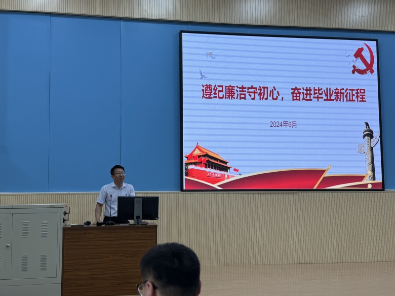学校纪委监督检查室主任李健以“遵纪廉洁守初心,奋进毕业新征程”为题对即将离开学校的毕业生党员进行廉洁从业教育。李健通过丰富的案例,提醒并教育同学们在面对人生道路上的各种压力和诱惑时,要牢牢守住自己的初心,树立并坚守正确的世界观、人生观、价值观。他对毕业生党员提出几点期望与要求:一是要深刻理解“遵纪”二字的重要性,要严格遵守党纪国法,始终做到心中有戒、行有所止;二是要坚守初心,始终不渝,时刻保持清醒的头脑,不为诱惑所动,不为利益所扰,始终坚持党的宗旨和原则;三是要不断学习新知识、掌握新技能、适应新环境,努力成为党和人民需要的有用之才。