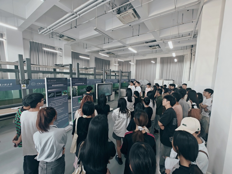 随后,大家参观了海洋多功能水池和流场测试水池。这两个实验室配备了先进的实验设备和测试系统,能够模拟各种海洋环境下的流体动力学现象。在实验室研究生的介绍下,大家了解了如何利用这些设备进行海洋工程结构物的性能测试、流体动力特性的研究以及新型海洋装备的研发等工作。通过实地观摩和互动交流,同学们深刻体会到了科技创新在海洋工程领域的重要作用,也更加坚定了自己投身海洋科技事业的决心。