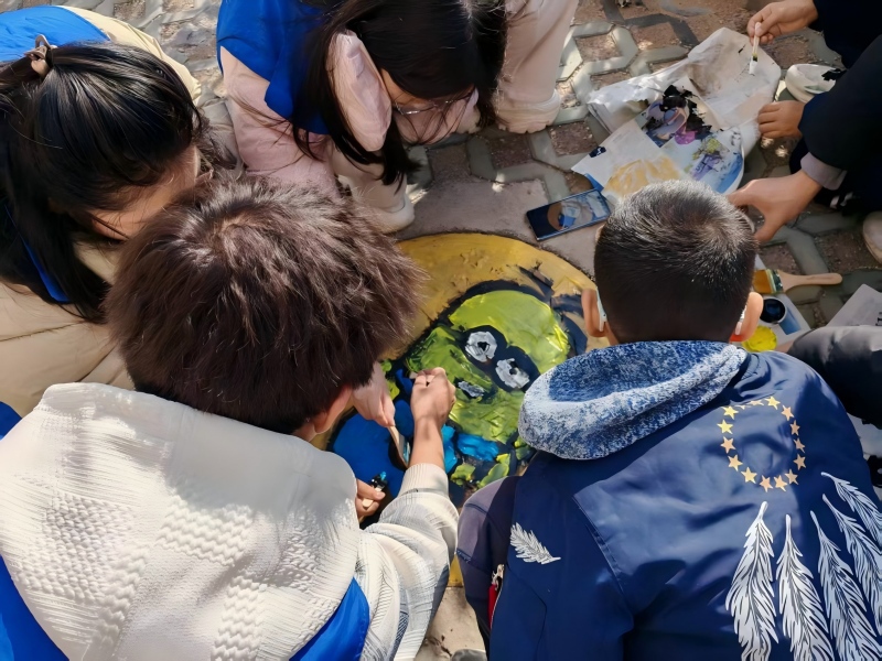 活动伊始,服务队成员与社区儿童、居民志愿者混合编组,三支小队领齐颜料后,以废弃报纸作调色盘,随即开启井盖美化的创意创作。创作过程中,大家分工协作、默契配合、充分发挥艺术想象力,让锈迹斑斑的井盖逐渐蜕变为“文明微景观”——方寸之间,画笔流转的不仅是创意,更是青年与社区居民共筑美好家园的心意。