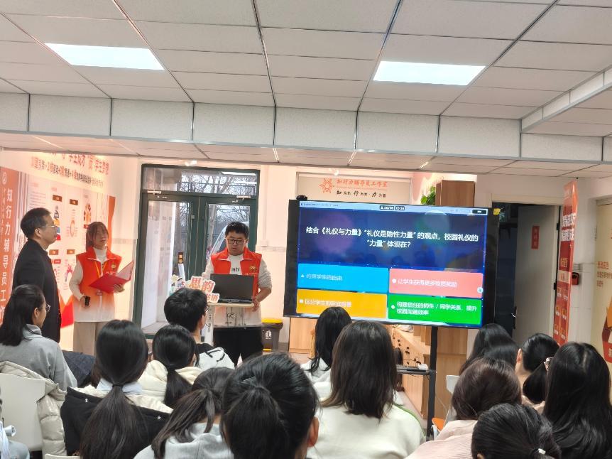 “不学礼,无以立”。活动伊始,杨武成围绕师生交往、同学相处、公共场合等校园高频场景,系统阐释礼仪实践要点,深刻剖析礼仪作为“修己以敬”的文化价值,帮助学生破除“礼仪是僵化规矩” 的认知误区,引导同学们深度理解礼仪不仅是外在规范,更是内在仁德与尊重的自然流露。