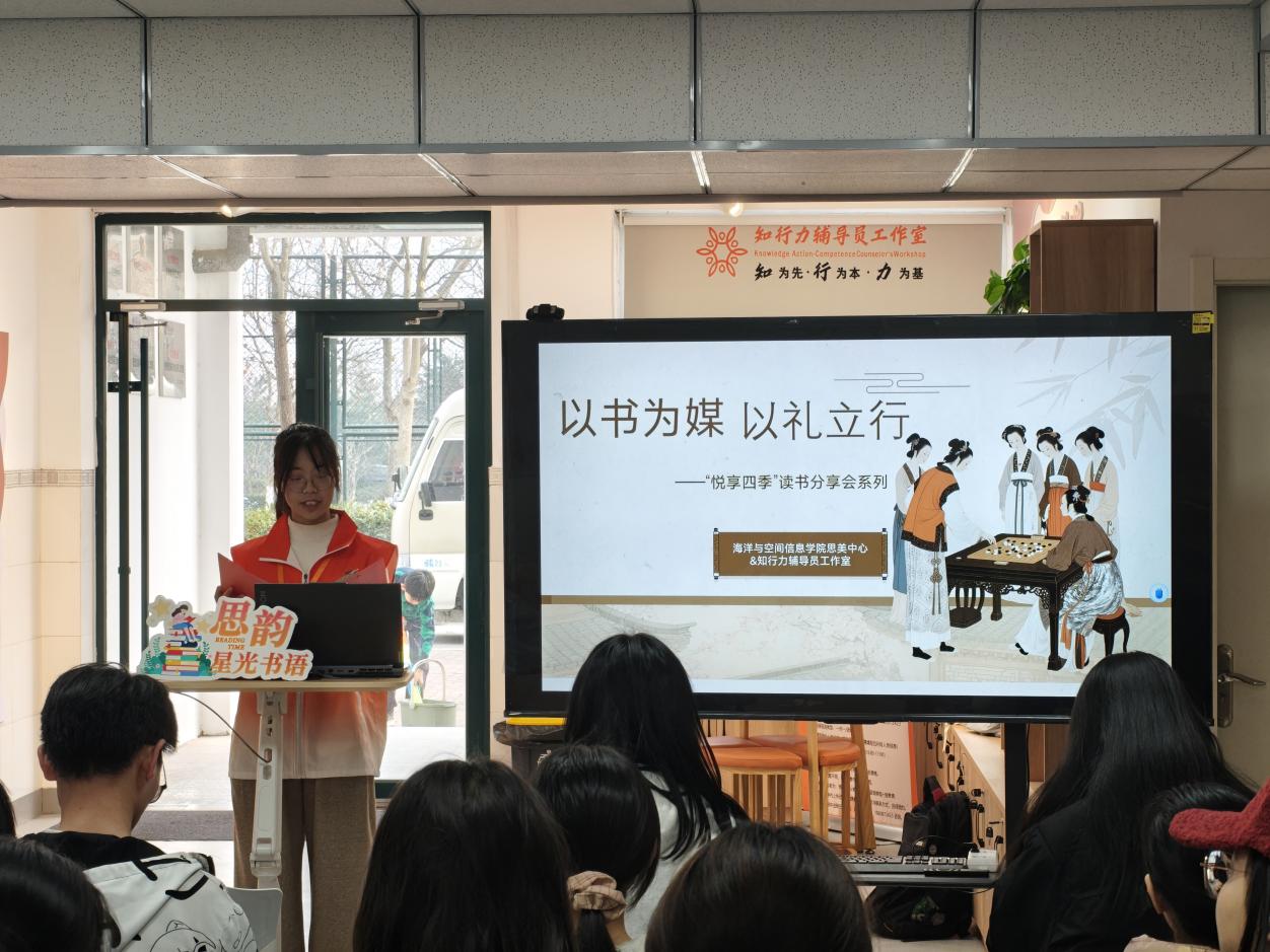 习近平总书记指出:“中华文明源远流长、博大精深,是中华民族独特的精神标识,是当代中国文化的根基。” 礼仪文明作为中华优秀传统文化的重要组成部分,承载着“人无礼则不生,事无礼则不成”的千年智慧。为引导大学生将礼仪文明的精神内核,转化为校园生活中的得体言行,进一步构建“心・行・象・格・智”大学生五阶成长体系,2025年12月7日,海洋与空间信息学院思美研究中心联合学校知行力辅导员工作室,在一站式学生社区服务中心成功举办“以书为媒,以礼立行”礼仪文化读书分享会。