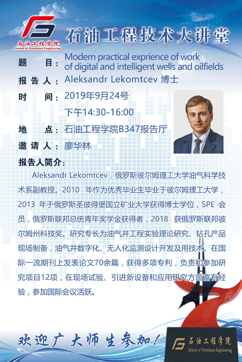 【石油工程技术大讲堂(第25期)】 Aleksandr Lekomtcev 博士学术报告