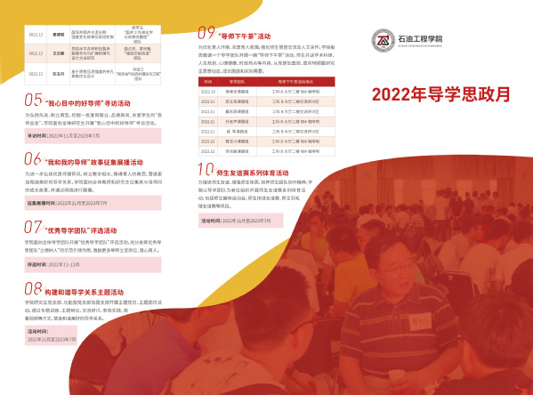 黄维安在导学思政月活动方案中介绍,为积极营造“教学相长、师生相宜、团队共建、和谐美好”的优良导学氛围,围绕学术科研、个人生活、职业发展等三个层面,学院面向所有导师和研究生,设计了党的二十大精神学习宣讲、研究生导师导学思政能力提升培训、“能源报国·能源强国”思想引领专题教育、研究生学术沙龙、寻访“我心目中的好导师”、征集展播“我和我的导师”故事、评选“优秀导学团队”、构建和谐导学关系主题党团活动、导师下午茶、师生友谊赛系列体育活动等十类活动内容。