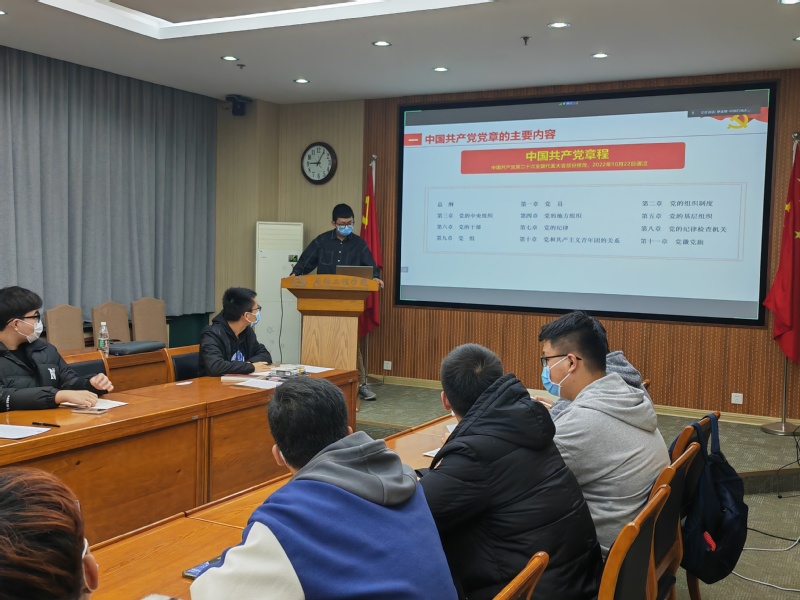 【本站讯】为响应二十大提出的全体党员应更加自觉地学习党章、遵守党章、贯彻党章、维护党章,为全面建设社会主义现代化国家、全面推进中华民族伟大复兴而团结奋斗的要求。11月28日,石工2019级第二党支部在工科b347举行了“学习二十大党章修正案,答题做先锋”的主题党日活动,会议由组织委员徐浩洋主持,全体党员参与。