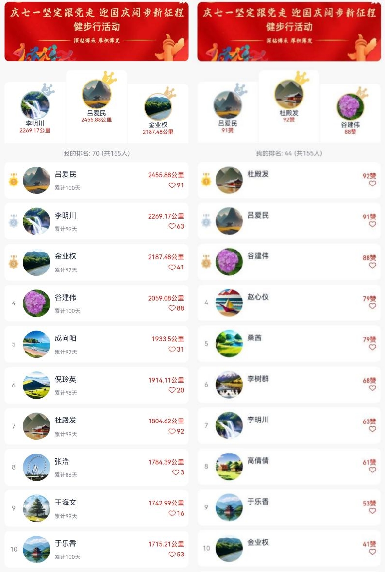 健步行活动自七一建党节开始,延续至国庆节后,历时百天,象征着学院教职工追随着党和国家,走过波澜壮阔的历程,走向无比光明的前程。全院教职工踊跃报名参与此次健步行活动,老师们在快乐中锻炼与感悟,促进了相互的联系与沟通,大家在排行榜上你追我赶、相互点赞,在愉悦心情、锻炼身体的同时,增进了彼此间的友谊,增强了学院凝聚力和向心力。