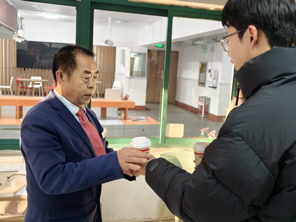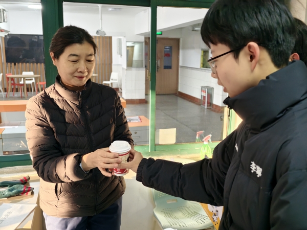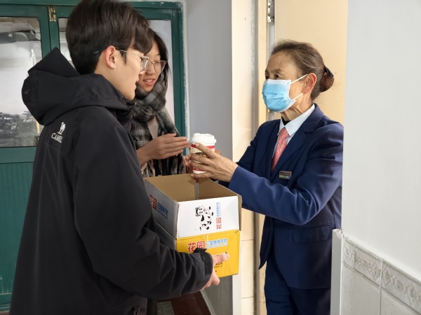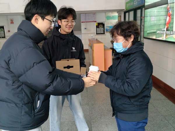 为提升派送效率、实现全覆盖,两支志愿者队伍分路行动,分别沿“10-17号楼物业—食堂—西北门门卫”与“1-9号楼物业—18-19号楼物业—北门门卫”两条路线同步推进。晨光中,志愿者们的身影穿梭在校园的各个角落。他们将热牛奶递到刚完成早间巡逻的保安师傅手中,送到正细致整理宿舍记录的宿管阿姨手边,也把这份温暖传递给正弯腰清扫路面的环卫工人心里。“天这么冷还想着我们,太暖心了!”宿管阿姨接过热饮时,紧紧握住志愿者的手,脸上的笑容驱散了寒意;环卫工人捧着温热的杯子,一声声真切的“谢谢”,成为这个清晨最动人的回响。