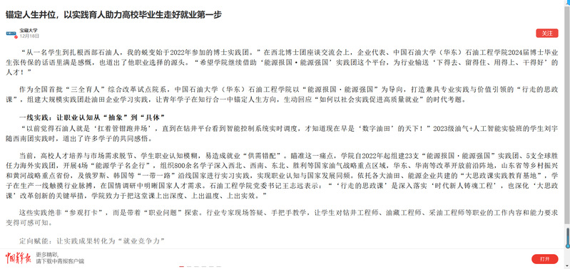 石油工程学院相关工作人员向《华夏时报》记者表示,“行走的思政课”累计惠及学生3000余人,带动一大批毕业生毅然投身能源行业。数据显示,近三年学院超95%毕业生赴能源行业就业,其中30%扎根中西部,用青春践行“到基层、到西部、到祖国最需要的地方建功立业”的承诺。