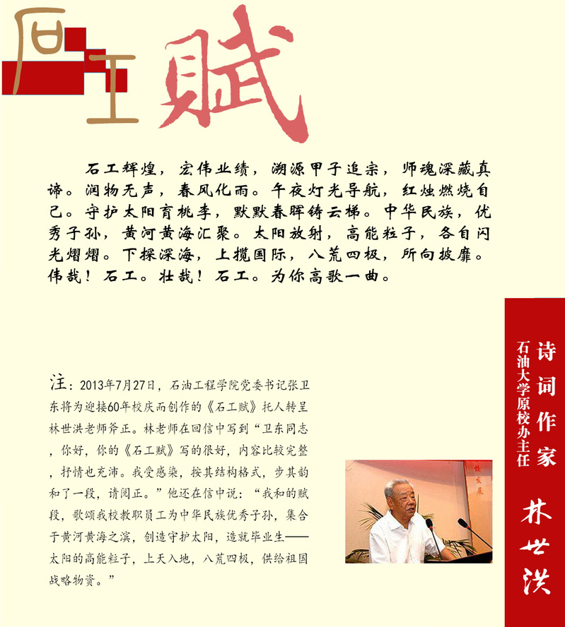 井架与采油机交叉重叠、互为衬托,刚柔相济,动静结合,井架两侧配以夸张的双翼造型,既像一本打开的书本,又像两只振翅冲天的大鹏。代表油气井工程和油气田开发两大国家重点学科融合交叉,共同发展,学术日益繁荣。