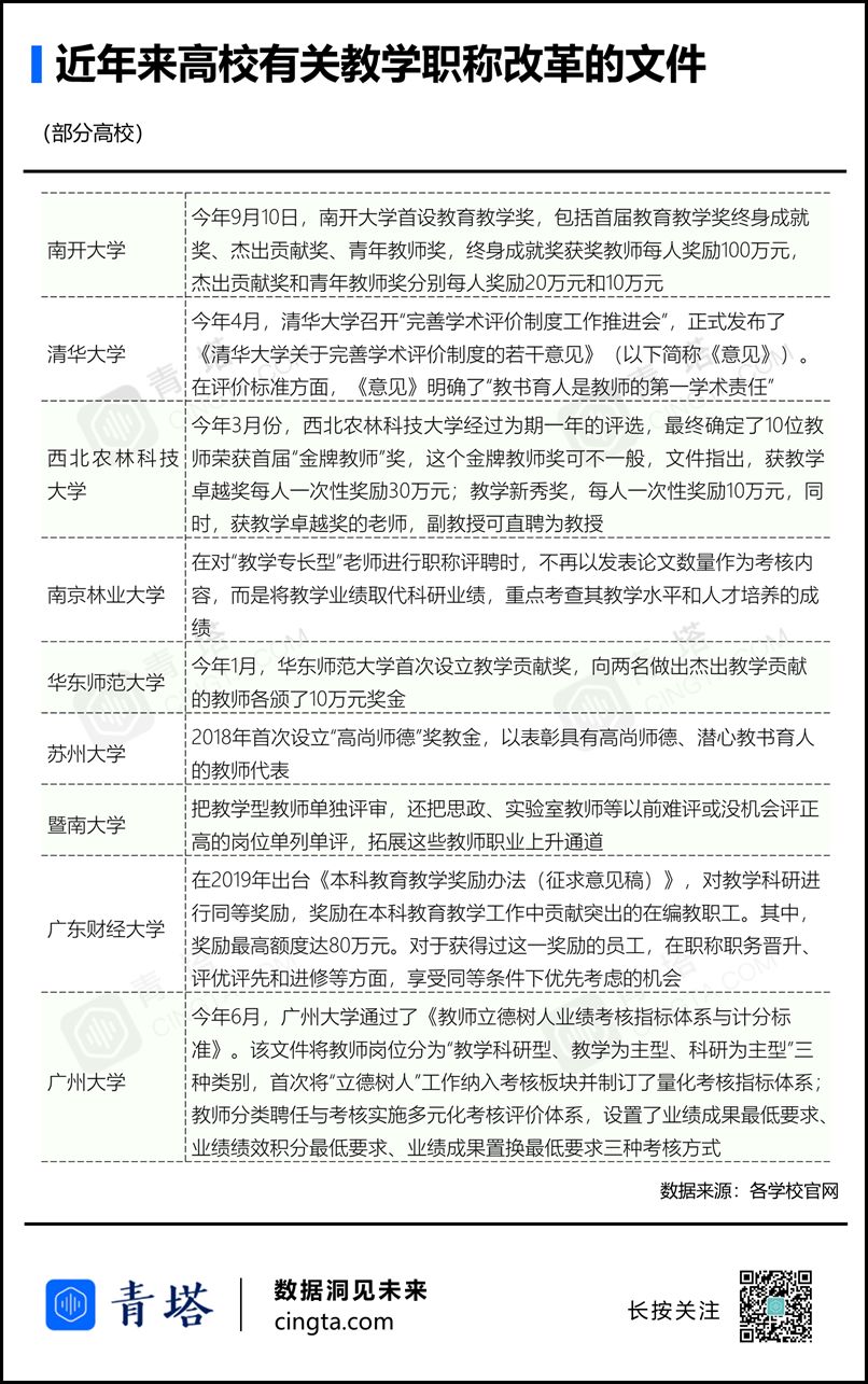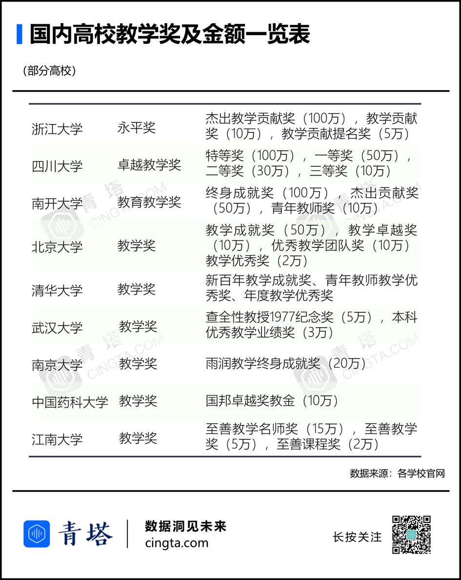 其实,在国家政策的推动下,各大高校也在积极行动,如南开大学刚刚设立的教育教学奖,评选出了包括首届教育教学奖终身成就奖2人、杰出贡献奖10人、青年教师奖10人,终身成就奖获奖教师每人奖励100万元,杰出贡献奖和青年教师奖分别每人奖励20万元和10万元。