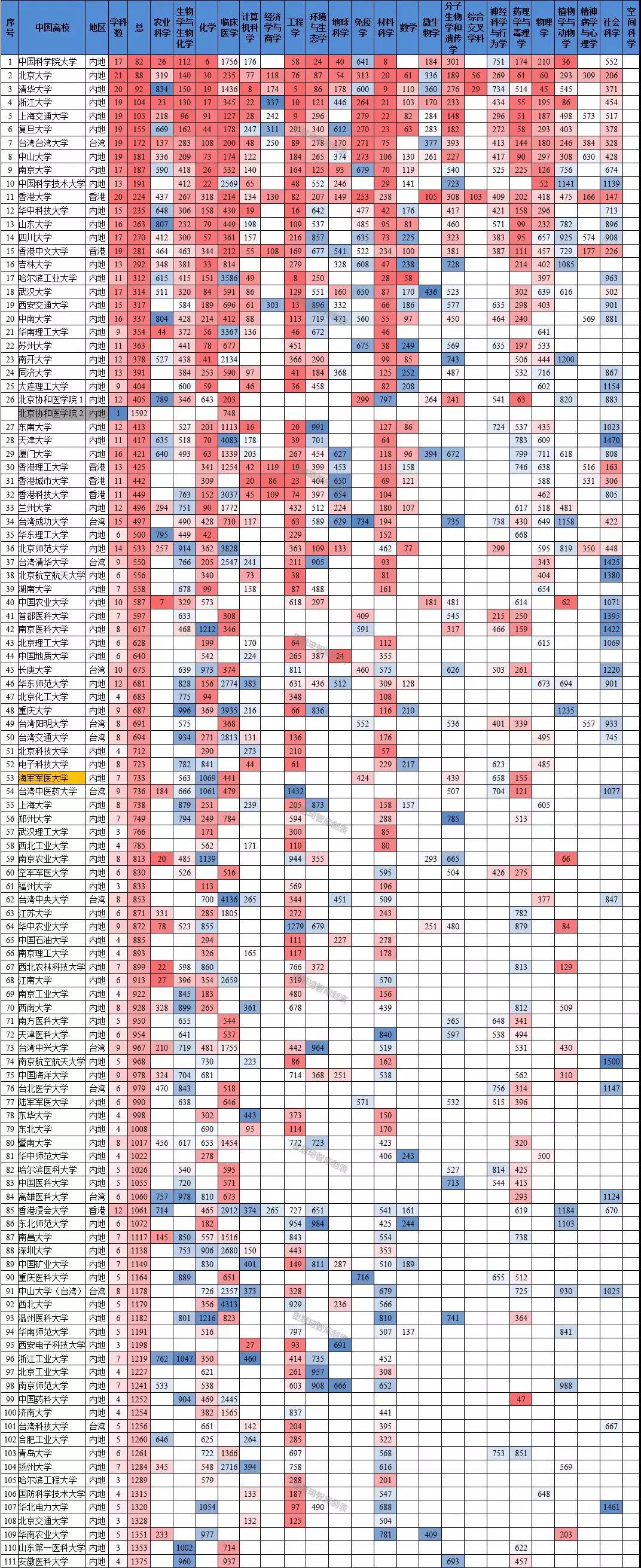 本次上榜的国内高校分布在21个学科,空间科学一个学科尚无内地高校进入。 新上榜6所高校:吉林农业大学(新增植物学与动物学学科)、贵州医科大学(新增临床医学学科)、皖南医学院(新增临床医学学科)、北京建筑大学(新增工程学学科)、北方工业大学(新增工程学学科)、铭传大学(新增社会科学学科)等6所高校为新晋高校。 此外,泰山医学院与山东省医学科学院合并组建为山东第一医科大学。合并前泰山医学院、山东省医学科学院均只有临床医学学科进入全球前1%,合并后山东第一医科大学有三个学科进入前1%:临床医学、生物学与生物化学、药理学与毒理学。 此外,33所高校学科数共增加35个,分布在17个学科,工程学学科新增6所高校,药理学与毒理学新增4所高校,化学、临床医学、环境与生态学分别新增3所高校。 此次按照总被引频次排名,下列表格按照学校总排名列示,横轴标题为22个ESI学科及各高校进入排行榜学科数分析,表格内容为各中国高校在各学科的国际排名。