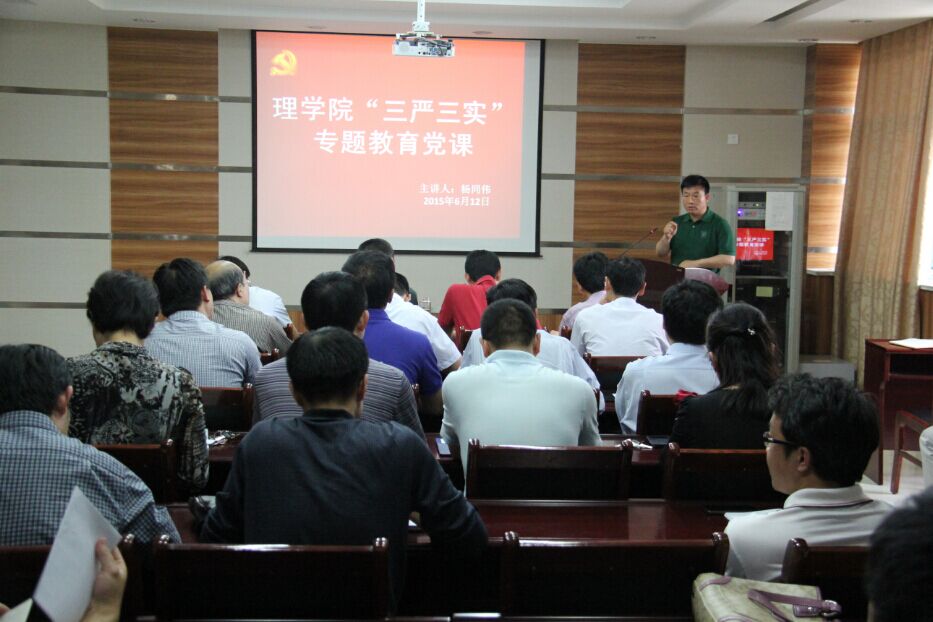 6月12日下午,理学院党委书记杨同伟面向全院干部开讲“三严三实”专题教育党课,学院领导班子成员,全院科级以上干部,系正、副主任参加党课。 杨同伟首先从“三严三实”专题教育的意义讲起,重点讲了“三严三实”是改革、发展、稳定的需要,是党的作风建设的重要措施,是党的群众路线教育实践活动的延续,也是干部队伍建设的需要。 杨同伟还概括讲了“三严三实”的内涵。第一方面:“严”。严以修身重在理想信念、提升道德境界,坚持道路、理论、制度自信(市场经济与社会主义制度),遵从社会道德、职业道德、家庭道德。严以用权重在分清公与私,明确权与法的界限,严禁公权私用,法内用权,依法办事。严以律己重在存敬畏、需慎独、遵纪守法,对信仰、对法纪、对组织、对群众有敬畏之心。第二方面:“实”。谋事要实就是要联系实际,联系群众,从实际出发谋划事业和工作,知实情,接地气。创业要实就是敢于担当,务求实绩,对党尽责,对国奉献,为民分忧,树立正确的政绩观,多做打基础,利长远的事情。做人要实就是要忠诚老实,公道正派,工作、生活胸怀坦荡,言行一致,表里如一。 杨同伟还对全院干部提出了三点要求:第一,要提高认识,顺势而为。认真领会三严三实专题教育活动的精神,把握实质。结合三严三实专题教育,联系自身实际和工作实际,将认识统一到中央和教育部精神,统一到学校的要求上来。第二,担责用权上要严。对照三严三实要求,修身、克己,增强干部的承载力和驾驭能力。从学校、学院和本单位发展出发,主动加压担责,增强责任担当,多做打基础、利长远的事。在即将到来的本科教学评估工作中,以评促建,将学科建设、实验室建设及合理布局、专业建设、13版培养方案认真梳理,做深做细。第三,服务师生上做实。强化服务意识,创新服务方式,主动增加服务内容,提高服务水平,最大限度满足师生愿望。