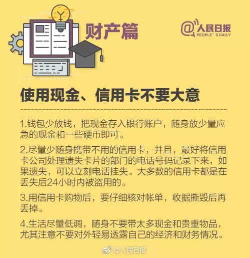 不要携带大量现金,不要露财,最大限度的使用银行卡、支票等支付工具。如果遇到危险,记得弃财保命。牢记或另行记录护照、银行卡、支票号码等,确保丢失后能准确及时的挂失、报案。