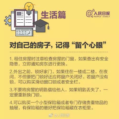 对于刚刚抵达国外的新生,建议最好选择住在学校宿舍。如果要租房记得不选择偏远地方,详细了解合同条款,谨慎选择房东和合租人。要早点回家,避免晚上单独出门。经常将自己的行踪告知房东、朋友或亲戚。