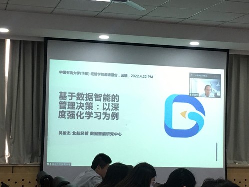 4月22日,经济管理学院于文理楼580举办第66期黄岛商科讲坛。本次论坛邀请北京航空航天大学长聘教授、经济管理学院副院长、国家杰出青年科学基金获得者吴俊杰教授,作题为“基于数据智能的管理决策:以深度强化学习为例”的学术报告。本次报告由副校长、经济管理学院院长周鹏教授主持,副院长渐令教授及部分教师、研究生参加本次报告。