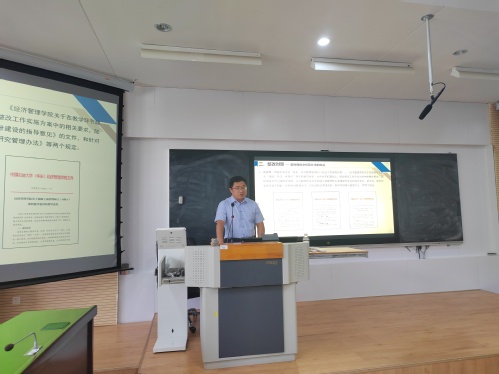 徐小峰副院长代表学院汇报通过认证以来学院整改工作的进展,他从战略规划、课程建设、师资培养、科研提升、校友工作等各个层面逐项进行汇报。