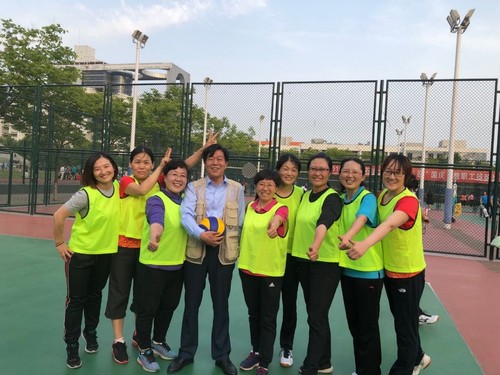 范秋芳教授与学院女排队员合影(2019年校教职工排球赛,王芳芳提供)