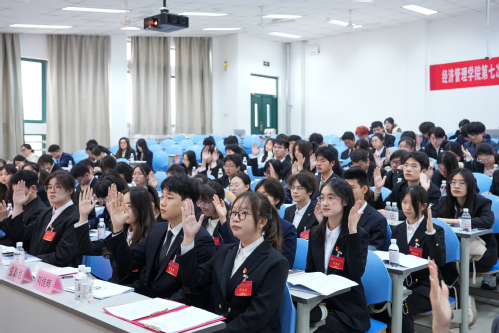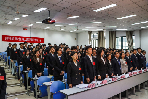 在随后的第一次全体会议中,陈楚佳妮代表经济管理学院学生会、李劲潮代表经济管理学院研究生会作出工作报告。