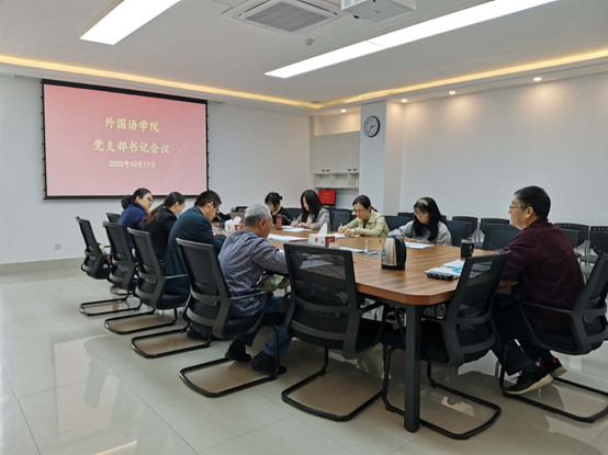 10月17日下午,外国语学院召开党支部书记会议,传达上级有关文件精神,部署本学期重点工作。会议由学院党委书记张永宁主持,党委副书记邹维忠、各支部书记出席会议。