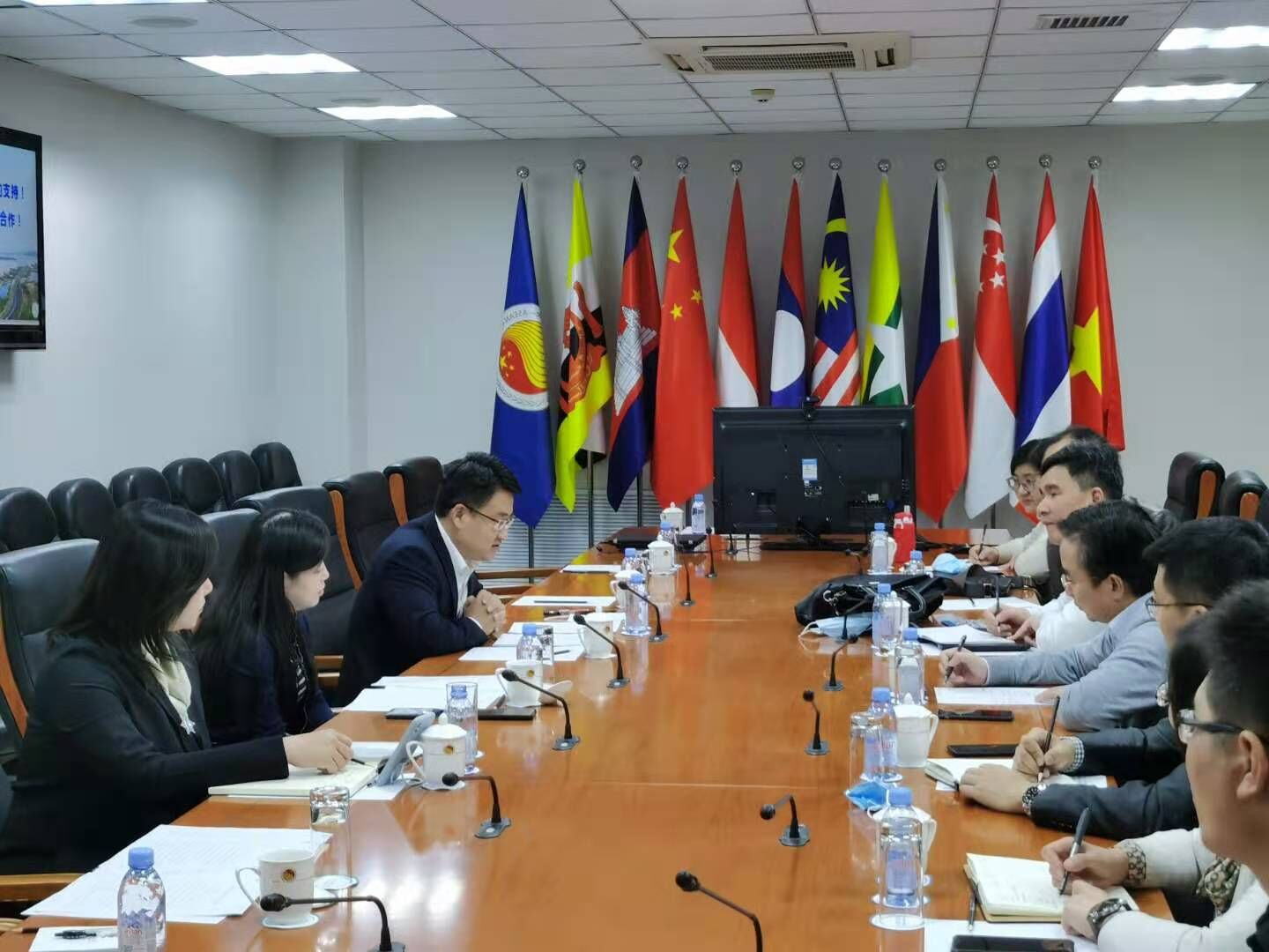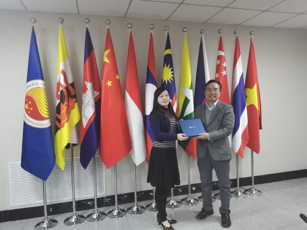 黄方向中国-东盟中心代表介绍学校发展历程、概况和学校对外交流合作及国际化建设情况。王林简要介绍学校支持毕业生到国际组织实习和任职方面的工作。