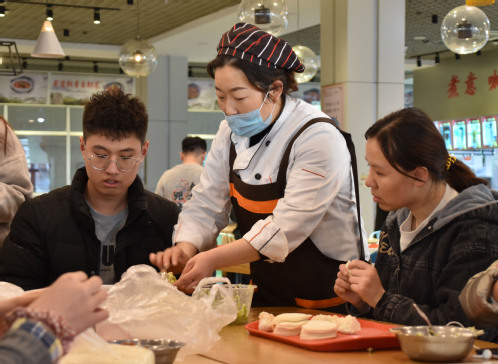 餐厅阿姨指导团支部成员包饺子 李文慧 摄