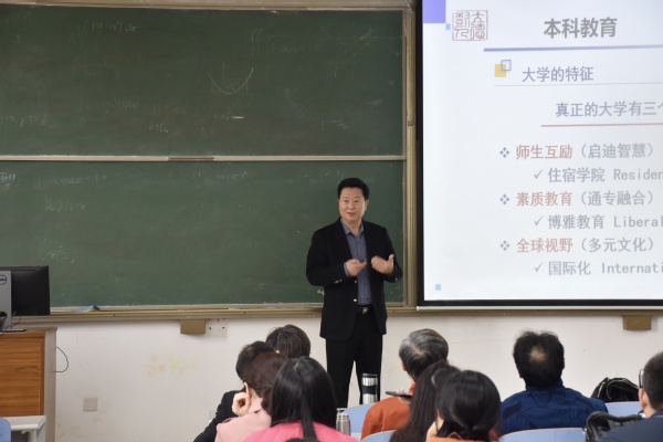 4月15日下午,王铭玉教授的第二场讲座以 “本科教育与课程建设”为主题。王铭玉教授从本科教育的历史渊源入手论述了大学发展的基本规律,指出新时代中国高等教育面临的四个变化,强调了本科教育在云开体彩下载官网首页工作中的基础性地位,要坚持“以本为本”,推进“四个回归”,全面振兴本科教育。在对本科教育进行深刻且深入的分析后,王教授以生动丰富的案例讲解了“金课”的内涵、类型和建设路径。最后王教授以“教师与学生:何为中心”“教学与科研:何为目的”“授业与解惑:何为手段”和“理论与实践:何为根基”四大问题结束本次的精彩讲座。