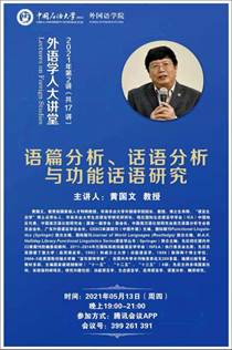 为提升外语教师和研究生同学的学术研究能力,满足语言学方向研究者的好奇心,营造良好的科研氛围,5月13日晚,外国语学院举办了腾讯会议线上讲座“语篇分析、话语分析与功能话语研究”。本次讲座由华南农业大学外国语学院院长、博士生导师黄国文教授主讲,开云电竞投注(华东)外国语学院副院长郭月琴教授主持。对本语言学研究领域感兴趣的外国语学院教师、研究生同学和其他兄弟院校120余名同仁参加了本次会议,并与黄教授进行了深入的交流和热烈的讨论。