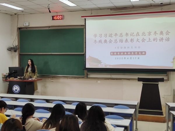 2022年4月16日下午14时,全体学生党员线上共同观看了人民网推出的“同上一堂‘冰雪’思政大课”直播。思政课结束后,各学生党支部分别组织支部成员线下共同学习习近平总书记在北京冬奥会、冬残奥会总结表彰大会上的讲话。学习中,大家一起探讨北京冬奥会、冬残奥会相关术语的翻译,并结合自身工作学习实际,积极思考,踊跃互动,展现了外国语学院学生的风采。