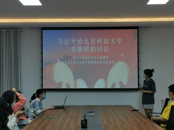 第三小组讲解人段和煦同志带领大家学习习近平总书记给北京科技大学老教授的回信。组员黄晓慧同志分享道:“我们都是收信人!通过学习习近平总书记给北京科技大学老教授的回信,深受教育鼓舞,我们要扎实专业学习,勇于创新学习,夯实学识基础,锻炼实践技能,努力成为德才兼备的人才,为民族复兴作出新的更大贡献。请党放心,强国有我。”