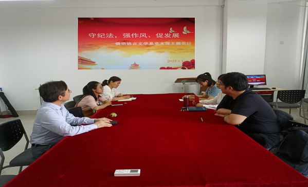 为深入开展党风廉政建设,不断增强党员廉洁意识,2022年6月1日下午,俄语语言文学系党支部在文理楼344组织开展了“守纪法、强作风、促发展”主题党日活动。院长毛浩然同志参加了此次活动。