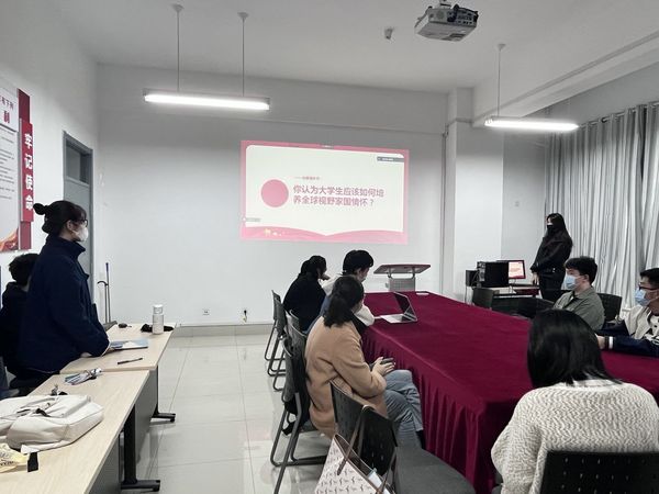 刘思秦同志围绕“促进世界和平与发展,推动构建人类命运共同体”这一主题分享学习感悟,她指出,我们所处的是一个充满挑战的时代,也是一个充满希望的时代,我们应当真诚呼吁,世界各国弘扬和平、发展、公平、正义、民主、自由的全人类共同价值。她向大家提出了引人深思的问题:“大学生应当怎样培养家国情怀?”对此,李冰同志给出了自己的答案:“看完张京回击名场面,更让我懂得了用最温柔的语气说出最有力量的话。也让我明白作为外语人,在国际上同样也能发挥重要的力量。当前,我国正处在世界百年未有之大变局和中华民族伟大复兴战略全局同步交织的历史时刻,国内外形势复杂严峻。面向‘两个大局’,胸怀‘国之大者’,要有振兴中华、服务家国的意识自觉。千里之行,始于足下,作为大学生,我们当下一定要好好学习,要相信小语种也有大作为。作为新时代的中国青年,我们应不负时代嘱托,踔厉奋发,奋勇前行,做国家最有力的后备军!”