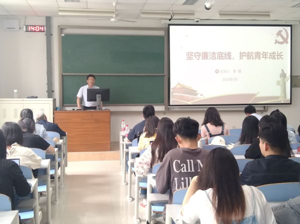 为筑牢毕业生崇廉尚洁的思想根基,引导学生树立廉洁观,提高廉洁从业意识,扣好职业生涯的“第一粒扣子”,在学习、工作岗位上发挥好先锋模范作用,5月25日,外国语学院在南教208举行2023届毕业生廉洁从业教育讲座.本次讲座邀请学校纪委监督检查室主任李健主讲,主题为“坚守廉洁底线,护航青年成长”。讲座由外国语学院党委副书记邹维忠主持,学院党委书记朱惠平、专职组织员王增举、毕业班辅导员梅琳、王英明以及学生党支部委员、2023届毕业生党员参加。