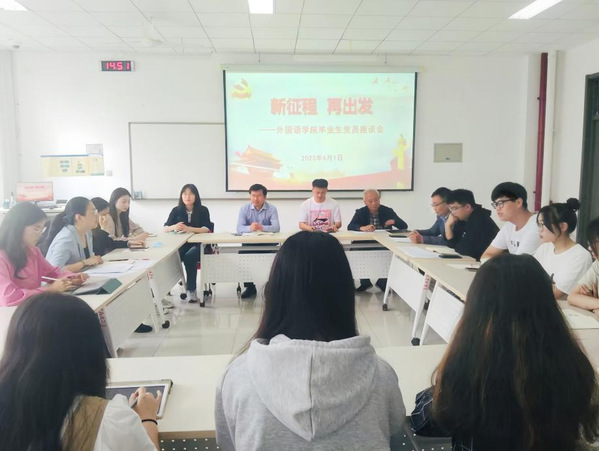 为进一步加强毕业生党员党性修养和责任意识,引导党员发挥示范作用,带头做好文明离校工作,5月1日,外国语学院在综合楼A429举行2023届“新征程 再出发”毕业生党员座谈会。本次座谈会由毕业班辅导员梅琳主持,学院党委书记朱惠平、副书记邹维忠、专职组织员王增举、毕业班辅导员王英明以及13名学生党员代表参加。