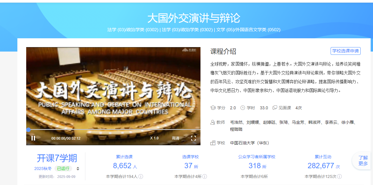 3. 在线课程:《大国外交演讲与辩论》课程在UMOOCs和智慧树平台上线,获300多所高校师生选课