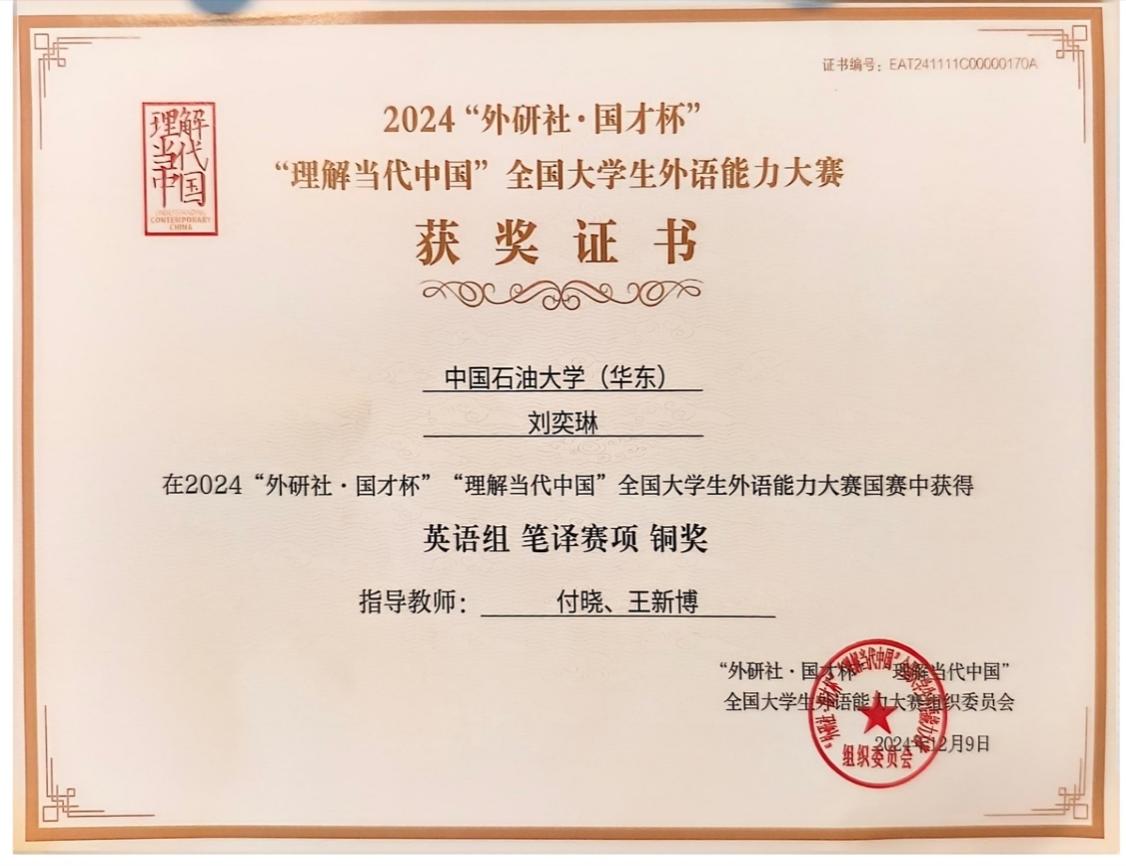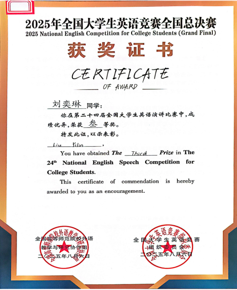 10.刘奕琳,“外研社国才杯”全国大学生外语能力大赛铜奖