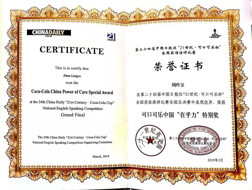 12.周玲玉,“21世纪•可口可乐杯”全国大学生英语演讲比赛,可口可乐中国“在乎力”特别奖