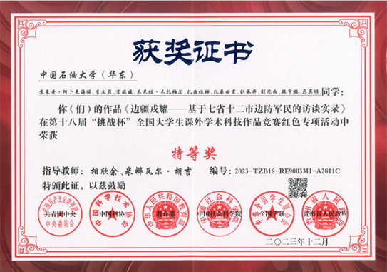 1.马宾璇等,第十八届“挑战杯”全国大学生决赛红色专项特等奖