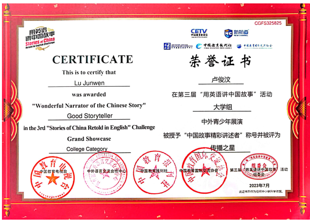 26.卢俊汶,“中国故事精彩讲述者”称号、传播之星