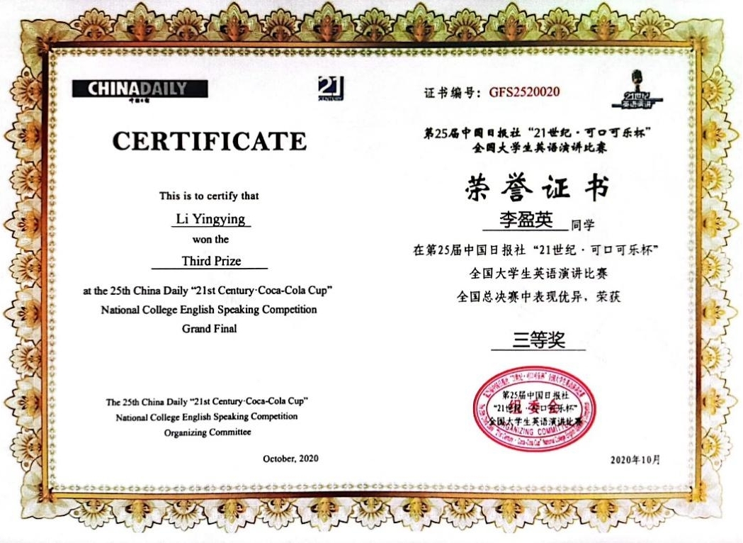 13.李盈英,“21世纪•可口可乐杯”全国大学生英语演讲比赛,全国总决赛三等奖