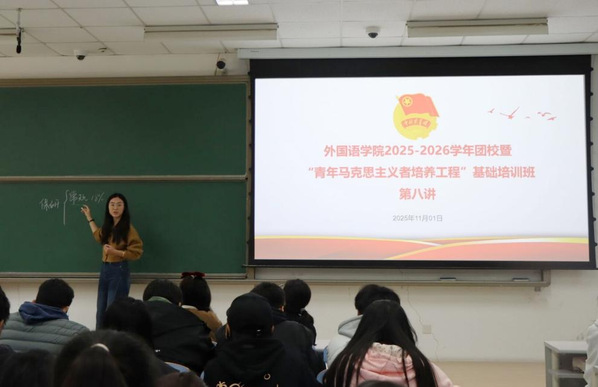 11月1日,外国语学院2025-2026学年团校暨“青年马克思主义者培养工程”基础培训班第八讲于南教110顺利开展。本次课程以“青春支教路,志愿暖人心”为主题,由外国语学院兼职辅导员马然朋主讲,培训班全体学员参与学习。