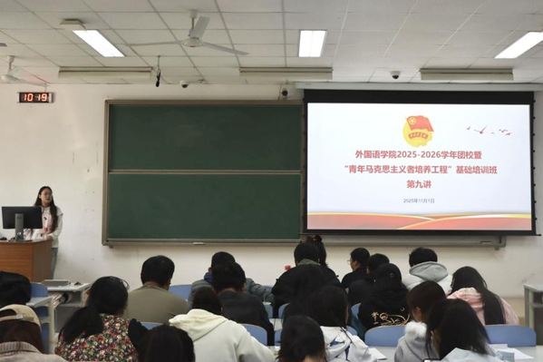 11月1日,外国语学院2025-2026学年团校暨“青年马克思主义者培养工程”基础培训班第九讲在南教110顺利开展。本次课程以“社会实践政策宣讲与案例展示”为主题,由外国语学院团委副书记马晓雯主讲,培训班全体学员参与学习。