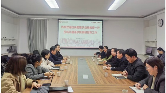 院长毛浩然对于连栋一行来院调研指导工作表示热烈欢迎,并代表学院做工作汇报,介绍了学院“十四五”规划完成情况,当前面临的主要问题,“十五五”工作设想、思路与举措等,重点就学科建设、云开体彩下载官网首页、师资队伍、科学研究等方面进行了汇报,表示将立足实际、广泛调研,科学谋划未来五年目标任务,推动学院实现新的发展。学院党委书记朱惠平从党建引领、队伍建设、公共外语教学改革、学科专业发展方向等方面汇报了学院当前存在的主要问题和下一步的思路举措。与会人员围绕生源质量状况、学科交叉融合、师资队伍引育、公共外语教学质量提升等方面进行了交流。