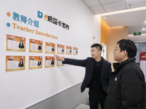 在爱迪卡教育相关负责人的陪同下,学院一行参观了企业的教学办公场地、实训课堂及成果展示区,实地了解企业的运营模式、教学特色与人才需求方向。座谈会上,爱迪卡教育黄岛校区负责人王越详细介绍了企业的发展概况、业务布局以及近年来在教育领域取得的成果,重点阐述了企业在人才招聘、实习培养方面的标准与规划,表达了与高校深化合作、吸纳优质外语专业人才的强烈意愿。